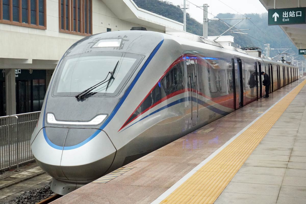 Es gibt noch eine weitere Baureihe, die CRH3A-A. Dabei handelt es sich jedoch nicht um einen Hochgeschwindigkeitszug im eigentlichen Sinn, denn diese achtteiligen Intercity-Züge sind im Regelbetrieb nur für 200 km/h zugelassen. Die rechte Aufnahme zeigt eine CRH3A-A-Garnitur im Bahnhof Huaxinan, der sich an der Guiyang Loop Line befindet. Insgesamt 12 Züge wurden hergestellt. Auch sie sind Verwandte der schnellen Velaro-Familie – daher der Name CRH3…