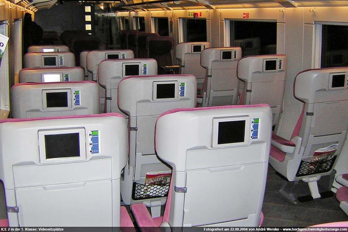 Erste Klasse: Nach dem Triebkopf folgte der Mittelwagen mit der Baureihennummer 805.3. Dieser war Fahrgästen der ersten Klasse vorbehalten. Damals existierte noch kein Rauchverbot in den Zügen, daher durfte an 21 Sitzplätzen geraucht werden. Die Nichtraucher konnten in der anderen Hälfte des Großraums mit 31 Sitzen Platz nehmen; eine Glaswand trennte die beiden Bereiche. Die erste Klasse erkannte man nicht nur an der üblichen 2+1-Bestuhlung, sondern auch an den roten Sitzpolstern der äußerst schlanken Sitze. Sie wogen nur noch die Hälfte – nämlich 25 kg – im Vergleich zum Pendant im ICE 1. Das erlaubte eine um etwa 10% erhöhte Sitzplatzzahl pro Wagen. Die Neigung der Rückenlehnen empfand der Berichterstatter spürbar eingeschränkter als im ICE 1. Einige Plätze bei Reihenbestuhlung hatten Videobildschirme in den Rückenlehnen eingebaut. Zwei Bordprogramme spielten Videos ab, wobei der Ton an den Audiomodulen zwischen den Sitzen mit kabelgebundenen Kopfhörern abgegriffen werden konnte. Das Audioprogramm im ICE 2 bestand ursprünglich aus drei Radiosendern und drei Bord-Kanälen. Am Ende des Wagens befanden sich zwei Toiletten. Es folgte ein weiterer Erstklasswagen mit der Nummer 805.0, der 53 Sitzplätze in Reihe und vis-à-vis fasste. In ihm durfte nicht geraucht werden. Abteile gab es im ganzen Zug keine mehr.[6][7]