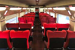 Ein Blick in die zweite Klasse des Thalys PBKA. Wie üblich eine 2+2-Bestuhlung. Das Foto ist von Oktober 2000; als ich 2003 abermals mit dem Thalys fuhr, waren die Sitze dermaßen verschlissen, dass es wirklich notwendig ist, die Inneneinrichtung zu erneuern.
