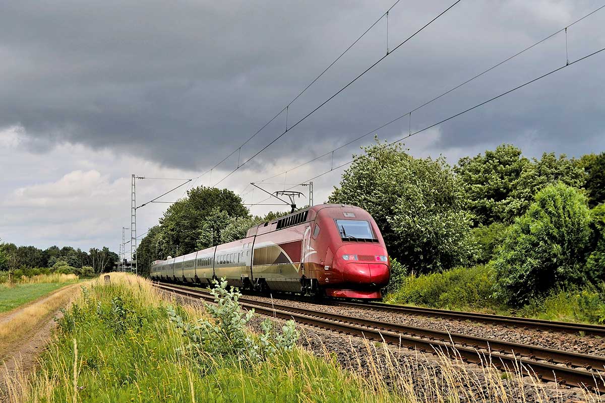 Thalys PBKA im „RubY“-Design bei Merzenich, Schnellfahrstrecke Köln – Düren.